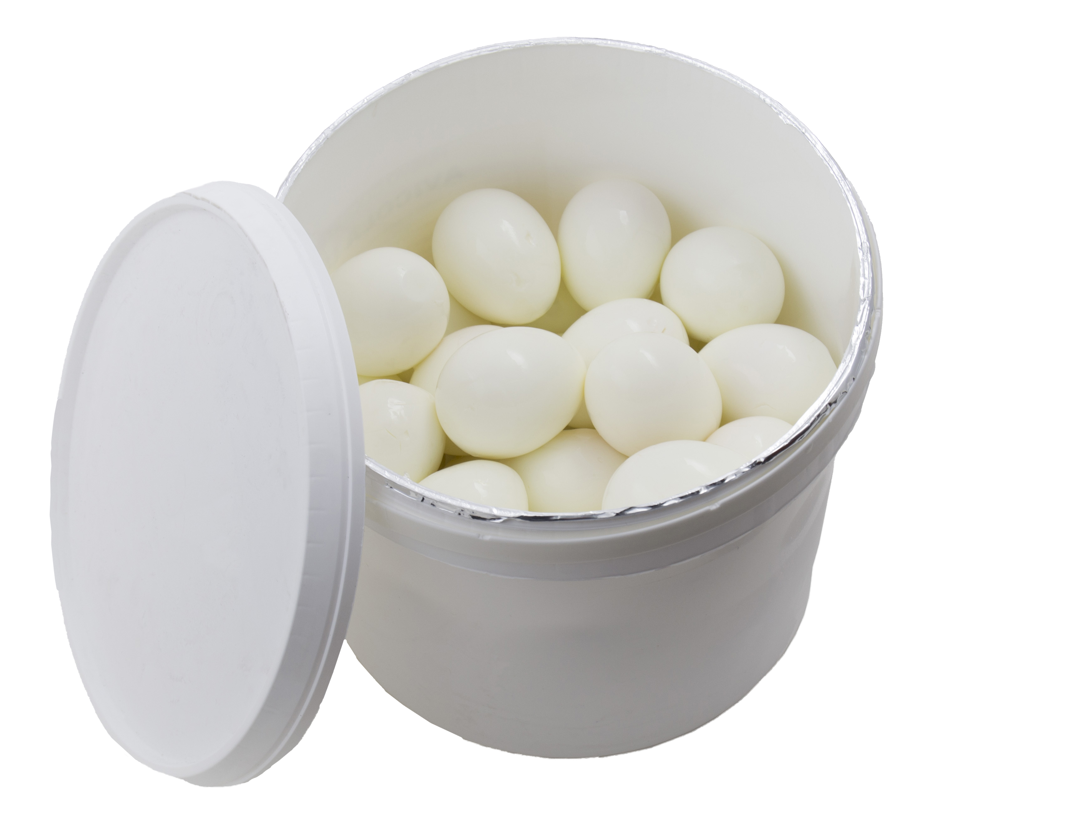 Cubo de 40 huevos de tamaño M y L (entre 53 y 73 gramos unitarios) cocido y pelado para mayor comodidad de trabajo.