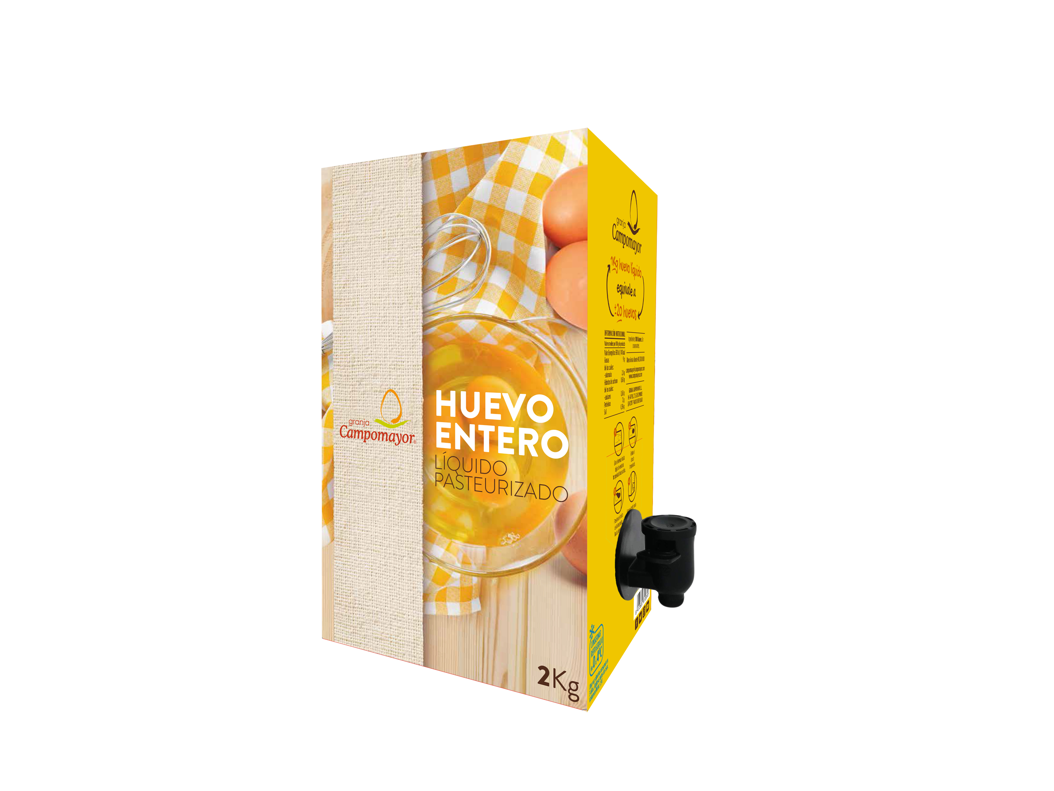 - 2kg: en Bag in Box. Equivale a +- 40 huevos. Este cómodo formato es fácil de almacenar y su sistema de vaciado mediante grifo hermético lo hace manejable en el día a día y muy higiénico.