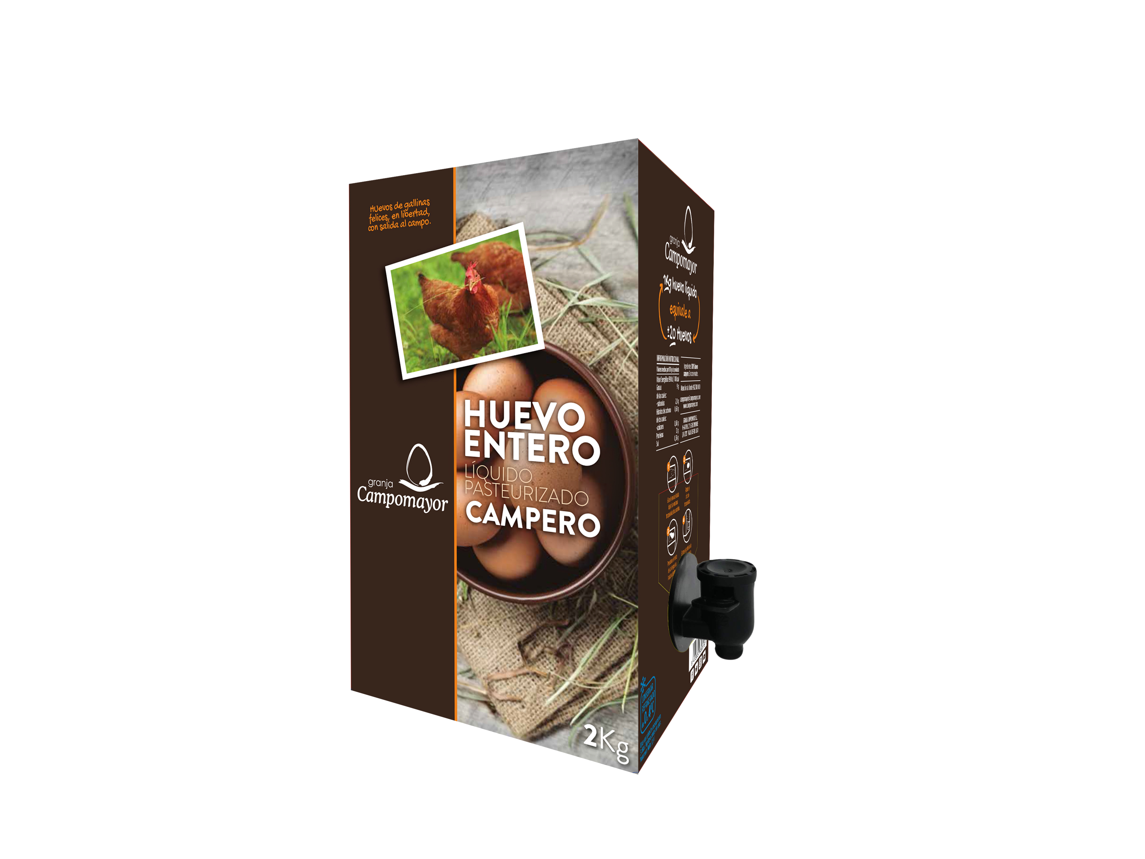 - 2kg: en Bag in Box. Equivale a +- 40 huevos. Este cómodo formato es fácil de almacenar y su sistema de vaciado mediante grifo hermético lo hace manejable en el día a día y muy higiénico.